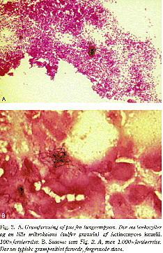 Mikroskopi: grampositiv, forgrenet bakterie (Fig. 2. A). Biopsi fra granulationsvævet viser en ydre zone af granulationsvæv og et centralt purulent materiale med neutrofile leukocytter, lymfocytter og plasmaceller omgivet af svovl-granula, der består af konglomerater af mikroorganismen (Fig. 2. B). Ofte kan der findes mange granula. Actinomyces skal dyrkes anaerobt i mindst fem dage.