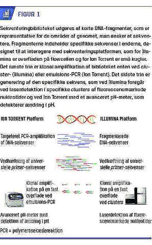 De fleste NGS-platforme gør brug af samme metodologi, nemlig fremstilling af et såkaldt bibliotek, klonal amplifikation, sekventering og dataanalyse. Biblioteksdelen er fremstilling af de dele af genomet, man ønsker at sekventere, f.eks. alle exoner ved WES og evt. opkoncentrering af disse fragmenter ved polymerasekædereaktionsamplifikation. Derefter følger den klonale amplifikation og selve sekventeringen, hvor nukleotiderne inkorporeres til en voksende DNA-streng, som digitalt aflæses undervejs som en sekvens. Den hyppigst anvendte NGS-platform er fra Illumina, hvis nærmeste konkurrent er Ion Torrent-platformen (Thermo Fisher Scientific) (Figur 1).