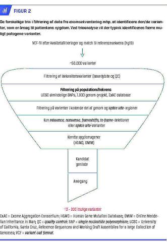 af disse nukleotidsekvenser til det humane referencegenom (alignment). I tredje trin identificeres forskelle ift. referencesekvensen (variant calling), og sidste trin består af annotering (identifikation af biologisk information om varianterne, f.eks. konsekvens på proteinniveau) og filtrering af de identificerede varianter (Figur 2). Afhængigt af den valgte filtreringsstrategi eller -prioritering er antallet af varianter, dvs. mulige mutationsfund, ved WES typisk et sted mellem 2 og 200. Ved trioanalyse (undersøgelse af patient og forældre) er antallet af varianter ofte mindre, da der også filteres for f.eks. de novo-varianter.
