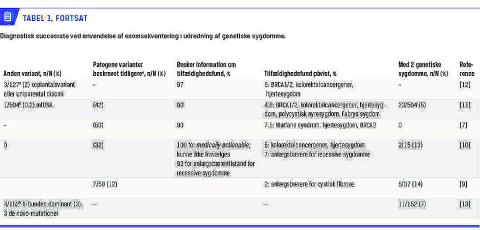 Anvendelse af WES i udredning af syndromer kan øge det diagnostiske udbytte væsentligt (Tabel 1). En sammenfatning af syv studier omfattende ca. 3.500 patienter viste en diagnostiske succesrate på 25-30% [7-13] eller højere, hvis den undersøgte patientgruppe var veldefineret, f.eks. patienter med neurometabo-
