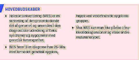 I de seneste år har exom- og genomsekventering forbedret den genetiske diagnostik af syndromer. Vi giver her en status over metoder, resultater og etiske aspekter af exomsekventering, der nu er implementeret i klinisk praksis.