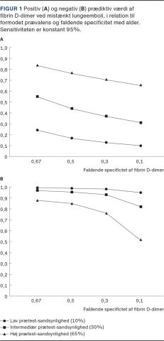 Den kliniske anvendelighed af D-dimer kompliceres dog af specificiteten, der ikke er tilsvarende høj og falder fra 67% hos de ≤ 40-årige til 10% hos patienter på ≥ 80 år, hvilket medfører en betydelig andel falsk positive. Således er antallet af D-dimer-målinger, det kræver at udelukke en lungeemboli (number needed to test) 3 i den gennemsnitlige akutmedicinske population og ≥ 10 hos patienter med cancer, infektion eller inflammatorisk sygdom [5, 7] (Figur 1). Dette afspejles i europæiske tal, hvor lungeemboli blot påvises hos ca. 20% af de patienter, der er henvist til CT-angiografi [8], og hvor en andel af embolierne er tilfældige og ikke kræver behandling, da de er små og sidder perifert [2].