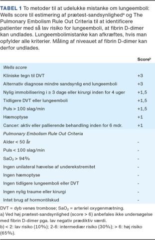 I nylige fælles retningslinjer fra European Respiratory Society (ERS) og European Society of Cardiology (ESC) anbefales det, at patienter, hos hvem der er klinisk mistanke om lungeemboli, som det første får estimeret prætest-sandsynlighed, f.eks. med den hyppigt anvendte Wells score (Tabel 1) [5, 6].