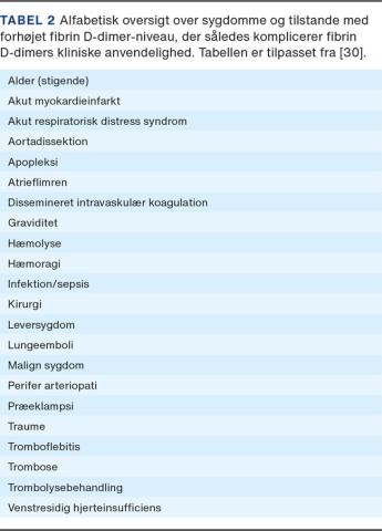 I forbindelse med tolkning af D-dimer bør der være opmærksomhed på tilstedeværelse af de mange sygdomme og tilstande, der kan reducere den diagnostiske præcision (Tabel 2).