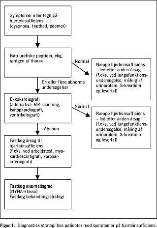 På grund af sygdommens hyppighed og de ofte uspecifikke symptomer er der tale om en stor population, der skal undersøges, hvis man skal finde de patienter, der har gavn af moderne hjerteinsufficiensbehandling. Et væsentligt problem er den begrænsede adgang til ekkokardiografi. I et dansk studie har man vist, at 5-6 patienter med hjertesvigtsymptomer fra almen praksis skal ekkokardiograferes for at finde en patient med nedsat systolisk funktion [3]. En estimeret incidens i befolkningen på ca. en pr. 1.000 pr. år betyder, at alene for at undersøge patienter med symptomer på hjerteinsufficiens skal der i Danmark udføres næsten 30.000 ekkokardiografier om året, hvilket svarer til ca. en tredjedel af det samlede antal undersøgelser eller en fordobling af antallet af undersøgelser med hjertesvigt som indikation. Der er derfor behov for en mere rationel diagnostisk tilgang til patienter med mulig hjerteinsufficiens. Udviklingen af nye højsensitive markører for hjertemuskeldysfunktion - natriuretiske peptider - forventes at muliggøre en sådan rationalisering af anvendelsen af ekkokardiografi. Formålet med denne statusartikel er derfor at præsentere en ny diagnostisk algoritme for patienter med symptomer på hjerteinsufficiens (Figur 1 ), som er i overensstemmelse med de nyligt publicerede europæiske retningslinjer [4].