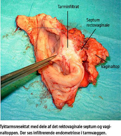 I. En 34-årig kvinde blev via vagtlægen indlagt akut på organkirurgisk afdeling på mistanke om appendicitis. Hun havde kvalme og konstante smerter i højre lyske. Der blev ved indlæggelsen ikke foretaget nogen gynækologisk undersøgelse eller supplerende billeddiagnostik. Kvinden blev indstillet til laparoskopisk appendektomi, hvor man fandt et patologisk område på caecum med indtrækning og induration. Pga. tumormistanke valgte kirurgen at konvertere til laparotomi og foretage en ileocækal resektion. Den patologiske undersøgelse af resektatet viste infiltrerende endometriose i caecum. Der var ingen tegn på dysplasi eller malignitet. Kvinden blev herefter henvist til gynækologisk afdeling, hvor man konstaterede »klassisk endometrioseanamnese«, idet hun havde haft kraftig dysmenorré, siden hun var ung, og smerterne var hørt op, da hun begyndte at bruge p-piller. Der blev foretaget en transvaginal ultralydskanning og en magnetisk resonans-skanning, som begge viste et rektovaginalt endometrioseinfiltrat.