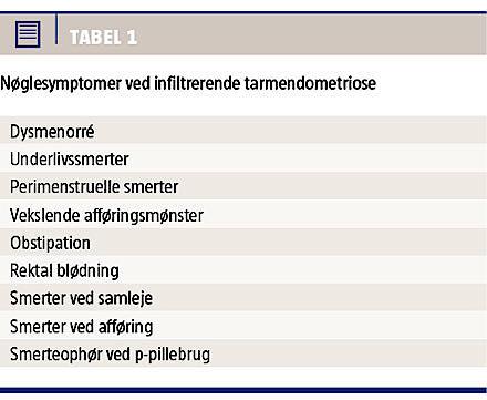 Symptomerne på infiltrerende tarmendometriose kan variere (Tabel 1). Et særligt kendetegn er cyklisk variation i smerterne, således at abdominalsmerterne er værst under menstruation. Det bør indskærpes, at kvinder, som er i den fertile alder og har længerevarende abdominalsmerter og et eller flere nøglesymptomer, bør henvises til præoperativ gynækologisk vurdering, hvor der kan foretages transvaginal ultralydskanning, som er en hurtig og effektiv ambulant undersøgelse for infiltrerende endometriose [3].