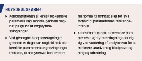 Kendskab til klinisk biokemiske parametres døgnrytmer i den kliniske hverdag bidrager med en mere præcis fortolkning af klinisk biokemiske analysesvar. Behovet for kendskab til døgnrytmesvingninger er blevet aktualiseret af 24/7-samfundet med længere ambulante åbningstider og et ønske om hurtigere diagnostisk afklaring af patienterne på alle tider af døgnet.