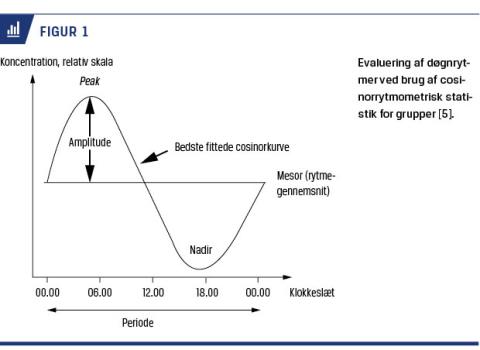 døgnet, og karakteriseres traditionelt ved brug af cosinorrytmometrisk statistik for grupper [5]. Under forudsætning af 24-timersperiodicitet fittes data til en kombineret cosinus- og sinusfunktion, og døgnrytmen præsenteres grafisk som den bedst fittede cosinorkurve [5]. Ud fra den fittede døgnrytmekurve beskrives døgnrytmen i forhold til de afledte parametre: perioden eller længden af rytmen, rytmens amplitude beregnet som halvdelen af forskellen mellem højeste og laveste punkt på den fittede kurve, mesor parameterens rytme tilpasset mean og tidspunkter for henholdsvis peak og nadir, hvilket svarer til tidspunkterne i løbet af døgnet for maksimum- og minimumværdi, der altid vil være med 12 timers mellemrum (Figur 1) [5]. Yderligere vurderes det, om døgnrytmen er signifikant på et 5%-signifikansniveau [5]. Da man med cosinorstatistik kun evaluerer det overordnede døgnrytmemønster og ikke vurderer afvigelser fra det, suppleres cosinoranalysen ofte med vurderinger af de individuelle tidsserier.