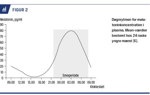 f.eks. kortisol eller melatonin. Melatonin, det naturlige nathormon, som produceres i corpus pineale, er reguleret af lyset, idet lys hæmmer og mørke fremmer produktionen. Melatoninkoncentrationen er således lav gennem dagen og stiger sent om aftenen og i løbet af natten med peak midt om natten [1] (Figur 2). Kortisolkoncentrationen øges i løbet af natten med maksimumkoncentration om morgenen [1].