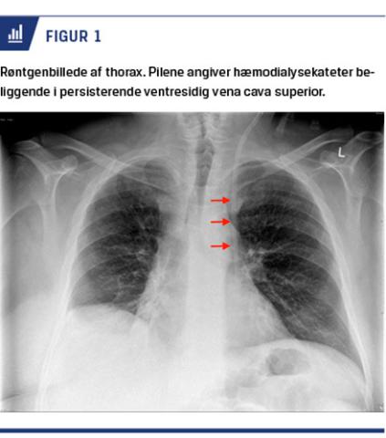interna (VJI). Forskellige forhold afgør valget af vene, og uanset adgang påtænkes spidsen af kateteret placeret i vena cava superior (VCS) ved indgangen til højre atrium. Efter anlæggelse kontrolleres korrekt placering ved røntgenoptagelse af thorax. I denne kasuistik beskrives et tilfælde, hvor et HD-kateter blev anlagt i en PVVCS, og efterfølgende komplikationer pga. usikkerhed om placeringen af kateteret.