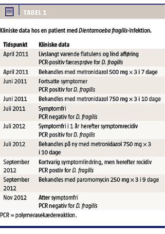 D. fragilis blev længe anset for at være en ikkepatogen amøbe; resultaterne af nyere studier har dog tydet på et patogent potentiale af denne organisme, hvor flere D. fragilis-inficerede patienter oplevede gastrointestinale symptomer, herunder diarré, løs afføring og mavesmerter [1]. Den kliniske betydning er dog fortsat usikker, bl.a. fordi parasitten er almindeligt forekommende også hos raske. I denne kasuistik beskrives en patient på 16 år med D. fragilis-infektion.