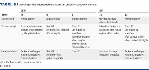 I de nyere udgaver af det amerikanske diagnosesystem (DSM) tillader man, at patienter med OCD kan være uden indsigt i tvangstankernes urimelighed og huse vrangforestillinger. I DSM-III (1980) var det et krav, at patienten anerkendte obsessionerne som et produkt af egne tanker. Det blev ændret i DSM-IV (1994) og DSM-5 (2013), hvor der blev tilføjet en underopdeling, hvor patientens grad af indsigt kunne angives. OCD i DSM-terminologi har således udviklet sig fra en tilstand med sande obsessioner til en diagnostisk enhed, der tillader manglende indsigt i tankernes rigtighed og endog vrangforestillinger [2]. Dermed bliver grænsen til psykotiske lidelser udvisket, i hvert fald hvad angår tvangstanker.