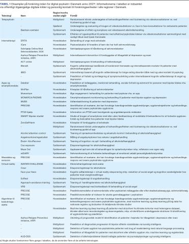 Anvendelsen af digitale løsninger i psykiatrien forventes øget i takt med udviklingen og den kliniske forskning på området (Figur 1). Denne artikel har til formål at beskrive den digitale udvikling inden for psykiatrien i Danmark med inddragelse af internationale erfaringer og perspektiver samt deraf følgende udfordringer og etiske overvejelser. Se Tabel 1 med eksempler på forskning inden for digital psykiatri i Danmark.
