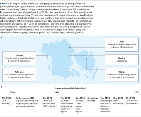 I 2018 besluttede man som led i RSD’s digitaliseringsstrategi at arbejde hen imod komplet diagnostisk digital patologi på regionens fire patologiafdelinger: OUH, Sydvestjysk Sygehus (Esbjerg), Sygehus Lillebælt (Vejle) og Sygehus Sønderjylland (dengang Sønderborg, nu Aabenraa) (Figur 1 A). Man opnåede en bevilling på godt 20 mio. kr. fra Regionsrådet i RSD, herunder Innovationspuljen, som blev anvendt til server- og lagerkapacitet ved datacenteret i Kolding, it-infrastruktur og indkøb af et digitalt billedhåndteringssystem (image management system (IMS)). Efter etablering af projekt- og styregrupper samt en klinisk referencegruppe blev beskrivelser af fremtidige arbejdsgange og udbudsmaterialer udarbejdet. Studiebesøg i Holland og Sverige blev også gennemført. Efter udbudsperioden blev der indgået en kontrakt.