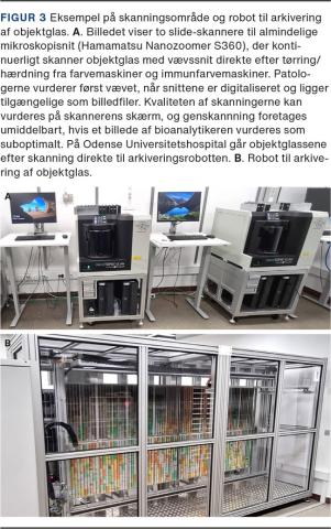 Det etablerede system er baseret på en fælles infrastruktur (Figur 1 A). Serveren og datacenteret er lokaliseret i Kolding. It-infrastrukturen består primært af to systemer: IMS (Figur 2 A-B) og laboratorieinformationssystemet (LIS), som i forvejen anvendes af alle patologiafdelinger i Danmark. LIS er linket til talegenkendelsesmodulet. Koblingen mellem IMS og LIS varetages vha. en speciel software (Sirenia). Afdelingerne købte slide-skannere til almindelige slides (Hamamatsu Nanozoomer S360) og til storsnit (Hamamatsu Nanozoomer S60) (Figur 3 A). Regionens fire patologiafdelinger producerer aktuelt en billeddatamængde på op til 4 TB/arbejdsdag.