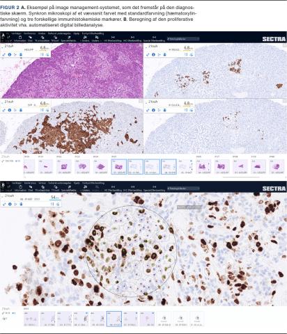 Digital patologi medfører gode muligheder for sikker diagnostik, idet overensstemmelsen mellem patologers diagnoser via konventionel mikroskopi og digital billedvurdering er op mod 98% [13, 14]. Vores erfaringer er, at løbende dobbelttjek af fysiske mikroskopiglas såvel som digitale billedfiler ikke er nødvendigt. Kvalitetsmangler relateret til de fysiske mikroskopiglas opdages som led i skanningsprocessen eller ved den efterfølgende mikroskopi via IMS, hvorefter fejlen rettes, og glassene genskannes. Ergonomien er generelt bedre end ved konventionel mikroskopi, med mere frihed i arbejdsstillinger, ligesom skift af objektglas klares ved tryk på 3D-mus frem for direkte håndtering af objektglas. Der spares tid med hurtige skift af objektglas, f.eks. i forbindelse med mikroskopi af et stort antal lymfeknuder eller større immunhistokemiske markørpaneler. Det er nemt at lave markeringer og målinger samt at udtrække mikroskopiske billeder af høj kvalitet, f.eks. med henblik på undervisning. Der er direkte adgang til samtidige og tidligere præparater. Supervision af afdelingernes uddannelseslæger foregår via skærmen med bedre mulighed for dialog. Digital patologi giver også muligheder for automatiseret DIA, f.eks. til kvantificering af den proliferative aktivitet (Figur 2 B) ved bl.a. brystkræft og neuroendokrine neoplasier [15-17].
