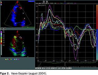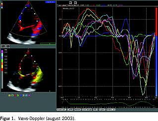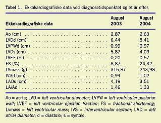 Infliximabbehandlingen blev seponeret, idet der var et tidsmæssigt sammenfald med behandlingen, og det ansås for at være udløsende agens for patientens kardiomyopati. På grund af patientens familiære disposition til IHS blev der bestilt en myokardieskintigrafi, som hun dog ikke ønskede at få gennemført. Patienten blev efterfølgende fulgt tæt på afdelingens hjertesvigtsklinik med indstilling af medicin og regelmæssige kliniske og ekkokardiografiske kontroller, som viste uændrede fund. Ved en ambulant kontrol få måneder efter, at diagnosen var stillet, bedømtes patienten som værende i NYHA-gruppe III, hun kunne klare gang i almindeligt tempo, men blev hurtigt forpustet ved mindre fysisk anstrengelse. Hjertetransplantation blev drøftet som en mulighed, såfremt tilstanden ikke blev bedre. Patienten udeblev herefter fra kontrol, men mødte igen op et halvt år efter. En ekkokardiografi ved denne kontrol, som var ca. et år efter diagnosetidspunktet, viste en normalisering af venstre ventrikels dimensioner og en kun ubetydelig mitralinsufficiens. En vævs-Doppler viste kun ganske beskeden nedsat vævshastigheder. Der fandtes således en markant bedring i det ekkokardiografiske billede med normalisering af hjertefunktionen (Tabel 1 , Figur 1 , Figur 2 ).