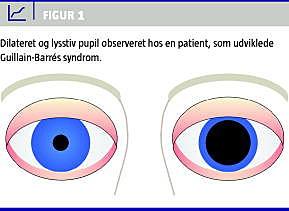I akut idiopatisk polyradiculoneuritis (Guillain-Barrés syndrom, GBS) er dilaterede, lysstive pupiller en sjælden manifestation [1-2], der skyldes parasympatisk dysfunktion af ciliarisnerverne. Vi præsenterer en patient med dilateret og lysstiv pupil, som udviklede et GBS.