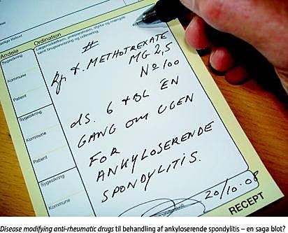 Med den tiltagende anvendelse af magnetisk resonans (MR)-skanning til diagnosticering af AS og med fremkomsten af TNF-hæmmere (infliximab, etanercept og adalimumab) til behandling af sygdommen, er der inden for de senere år kommet stadig større opmærksomhed på AS. Patienter henvises i stigende grad til de reumatologiske afdelinger med henblik på diagnostik og behandling [4, 5]. Før introduktionen af TNF-hæmmerne var behandling med et (disease-modifying anti-rheumatic drug (DMARD) standardterapi i de tilfælde, hvor symptomerne ikke kunne kuperes alene med et non-steroidal anti inflammatory drug (NSAID). De hyppigst anvendte DMARD'er har været sulfasalazin og methotrexat (MTX). Andre DMARD'er er leflunomid, guldsalte (auranofin og aurothiomalat), antimalariamidler (hydroxyklorokin og klorokin), azathioprin, penicillamin, ciclosporin og cyclofosfamid.