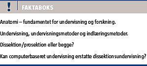 Dissektion (Figur 2) har i århundreder været en anvendt undervisningsform på lægestudiet, men de senere års besparelser og specielt færre resurser i forbindelse med brug af præparater har sat spørgsmåls-tegn ved, om det er den rette undervisningsform.