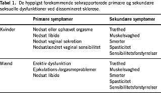 Hos skleroseramte kvinder er de hyppigste primære symptomer nedsat libido, nedsat eller manglende evne til orgasme, nedsat vaginal sekretion og vaginale sensibilitetsforstyrrelser. De sekundære symptomer, der hos kvinderne hyppigst påvirker seksuallivet negativt, er træthed, muskelsvaghed, smerter og spasticitet (Tabel 1).