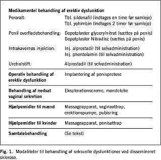 Dissemineret sklerose debuterer overvejende hos personer i alderen 20-40 år. Seksuelle dysfunktioner forekommer hos ca. 50% af alle kvindelige og ca. 75% af alle mandlige patienter på et tidspunkt i sygdomsforløbet. Hyppigheden tiltager med sygdommens varighed og graden af handikap. De primære seksuelle dysfunktioner omfatter erektionsproblemer, ændret libido og orgasme, ændret sensibilitet og nedsat vaginal sekretion. Sekundære organiske symptomer er spasticitet, føleforstyrrelser, inkontinens, smerte, træthed samt kognitive og adfærdsmæssige ændringer. De tertiære dysfunktioner er knyttet til generelle psykiske symptomer ved svær sygdom, bl.a. angst/bekymring for fremtiden, svigtende selvfølelse og ændret pardynamik. Hos mænd er hovedproblemet erektiv dysfunktion, hos kvinder nedsat libido, ophævet orgasme og nedsat vaginal sekretion. Af par, hvor ægtefællen er rask, har omkring en tredjedel samlivsproblemer, og par, hvor det er den kvindelige partner, der er rask, har generelt flest klager. Diagnostik og behandling bør ideelt ske i et »skleroseteam«, hvor hovedaktørerne er neurologer, urologer, (neuro)psykologer og sygeplejersker. I et sådant team kan behandlingen af og ikke mindst informationen om symptomer og årsagssammenhænge samt bearbejdning af tab varetages. Både for den enkelte patient og for parret kan ærlig og åben informerende samtalebehandling inklusive oplysning om seksuelle hjælpemidler og eventuel medikamentel behandling være stærkt korrigerende og motiverende og markant bedre livskvaliteten.