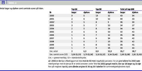 Der er i alt indsamlet 1.050 observationer for perioden 2000-2010. Tabel 2 opgør antal læger og djøfere i hhv. top-10-, top-30- og på hele top-100-listen. På top-10- og top-30-listen er djøferne i overtal, mens der er nogenlunde ligevægt mellem antal læger og antal djøfere på hele top-100-listen. Der er generelt en tendens til, at der bliver færre læger og flere djøfere i magtens top. Nederst i Tabel 2 er angivet gennemsnit og standardafvigelse (SD) for samlet score for de to grupper. Dette viser, at djøferne får et højere gennemsnitlig for samlet score . Gennemsnittet for samlet score for djøferne er statistisk signifikant større end for lægerne.