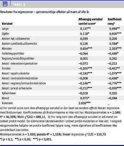 Tabel 3 viser den gennemsnitlige effekt af de forklarende variabler på hhv. samlet score og rang , som afhængige variabler. Både »læge« og »djøfer« har positive signifikante koefficienter, hvilket betyder, at personer med disse karakteristika har større magt end referencefaggruppen. Referencefaggruppen består her af personer uden nogen høj eller med ukendt uddannelse. I regressionsmodellen med samlet score som afhængig variabel er koefficienten for »djøfer« lig 0,118, hvilket betyder, at djøfere har en samlet score, der er 0,118 (på en skala fra 1 til 5) højere end referencefaggruppens score. Læger har derimod en koefficient på 0,137, hvilket dog ikke er signifikant forskelligt fra koefficienten for djøfere.