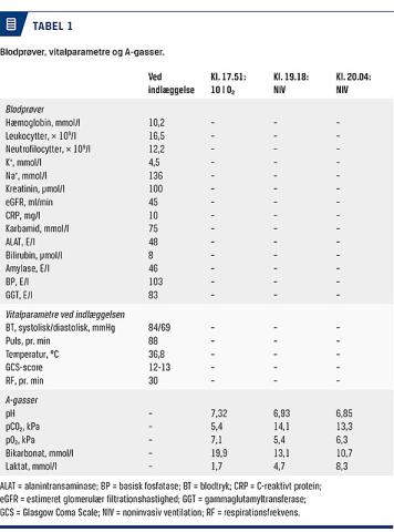 Ved ankomsten til akutmodtagelsen var hun hypotensiv (blodtryk (BT) 84/69 mmHg) (Tabel 1), mundslimhinden var tør, og hun var klinisk dehydreret. Hun havde desuden krepitationer bilateralt over begge lunger og hypoksi på blodgasanalyse med et ilttryk på 7,1 kPa på 10 l ilt. Partialtrykket af kuldioxid var normalt med 5,4 kPa.