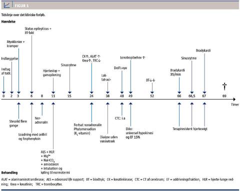 På grund af tiltagende hypotension påbegyndte man noradrenalininfusion. Efter otte timer udvikledes der pulsløs ventrikulær takykardi. Avanceret hjertestop- og amiodaronbehandling førte efter 20 min til spontan cirkulation og efter fire timer til sinusrytme og urinproduktion. Noradrenalindosis måtte løbende øges til 0,21 mikrogram/kg. Der blev givet magnesium- og bikarbonatinfusion. Pga. hypertermi (39 °C, målt i øret) blev hun kølet til normotermi. I løbet af de næste 48 timer udvikledes der fulminant leversvigt med syntesesvigt og umåleligt høje niveauer af alaninaminotransferase (ALAT) og aspartataminotransferase (ASAT), der allerede var > 1.000 IE/l 18 timer efter indtaget. Rabdomyolyse, kompromitteret nyrefunktion og svær hyperkaliæmi ledte til dialyse, der dog ikke afhjalp den tiltagende svære laktatacidose (laktatniveau 26 mmol/l og pH 6,99). En ekkokardiografi viste universel hypokinesi med en uddrivningsfraktion på 15%. Patienten forblev komatøs med ophævet vestibulo-kokleær-refleks uden sedation. En CT af cerebrum viste intet abnormt. Godt tre dage efter indtaget fik hun terapiresistent bradykardi.