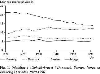 Danmark har et registreret alkoholforbrug, der er næsten det dobbelte af forbruget i Norge og Sverige (Fig. 1). Forbruget er gennem de seneste 25 år steget fra lidt under ti liter ren alkohol per voksen over 15 år til nu cirka 12 liter mod 5-7 liter i Norge og Sverige. Hjemmebryg udgør en lille del af det samlede forbrug, dog noget større i Norge og Sverige end i Danmark. Der kan også være forskelle mellem de tre lande på hvor meget alkohol, der indsmugles eller hjemtages ved rejser til udlandet. Selv om alle disse faktorer tages i betragtning, er der dog fortsat ingen tvivl om, at det danske alkoholforbrug er betydeligt større end det svenske og norske.