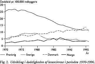 Det er bemærkelsesværdigt, at levercirrosedødeligheden i Frankrig i samme periode er faldet fra cirka 35 tilfælde til 15 tilfælde per 100.000 indbyggere, hvilket er på niveau med levercirrosedødeligheden i Danmark.