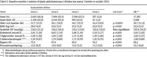 I forhold til gruppe 1 (inaktive) var den alders- og kønsjusterede dødelighed i grupperne 2-4 på henholdsvis 0,68 (95% CI: 0,64-0,71), 0,61 (95% CI: 0,57-0,66) og 0,53 (95% CI: 0,41-0,68). Længden af uddannelse var positivt associeret med fysisk aktivitet (p<0,001). BMI, kolesterol, triglycerider og procentandelen af rygere var negativt korreleret til fysisk aktivitet i fritiden (p<0,01) (Tabel 2). Systolisk blodtryk var ligeledes negativt korreleret (p<0,01), men dette var ikke signifikant efter justering for alder (Tabel 2).