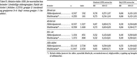 Den beskyttende effekt af fysisk aktivitet hos kvinder har været diskuteret, primært fordi der kun har været publiceret få studier om dette, og fordi der forekommer færre dødsfald i samme tidsrum end i studier af mænd. Dette studie inkluderer en stor population af kvinder, hvor der forekom næsten 3.000 dødsfald under opfølgningen. Vi fandt konsistent lavere dødelighed med højere aktivitetsniveauer i alle aldersgrupper, uanset hvilken type af aktivitet, som blev analyseret. Dette fandtes ikke i et studie af Blair et al (3). Flere skandinaviske studier har anvendt de samme spørgsmål om fysisk aktivitet i fritiden og på arbejdet som i dette studie, og alle viste en beskyttende effekt af fysisk aktivitet (2, 6, 7).