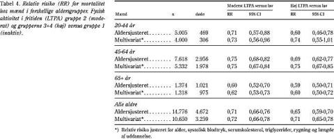 Resultater: I alt døde 2.881 kvinder og 5.668 mænd. Sammenholdt med de fysisk inaktive var den alders- og kønsjusterede dødelighed i aktivitetsgrupperne 2 til 4 (stigende aktivitet) henholdsvis 0,68, 0,61 og 0,53 (p <0,001) uden forskel mellem aldersgrupper og køn. Blandt de moderat og meget aktive fandtes en halvt så høj dødelighedsrate hos dem, som dyrkede sport, som hos de ikke-sportsudøvende. De, som cyklede til arbejde, havde sammenlignet med dem, som ikke cyklede, en dødelighed på 0,72 efter multivariatjustering, herunder justering for fysisk aktivitet i fritiden.