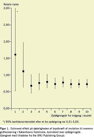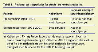 Organiseret populationsbaseret mammografiscreening blev indført i København i 1991. Siden da er validiteten af resultaterne af lodtrækningsforsøgene blevet intensivt debatteret [1]. Mammografiscreening blev kun indført i Københavns og Frederiksberg Kommuner samt i Fyns Amt, så de resterende amter udgjorde en naturlig kontrolgruppe i hele opfølgningspe-rioden. Gråzonescreening har endvidere været begrænset [2]. Vi udnyttede dette »naturlige eksperiment« til ved hjælp af de landsdækkende populations- og sundhedsregistre at udvikle en metode til vurdering af effekten af mammografiscreening på dødeligheden af brystkræft [3]. Vi præsenterer her resultaterne af de første ti års screening i København.