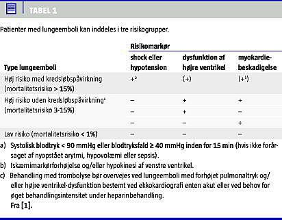 Prognosen for LE afhænger i højere grad af den hæmodynamiske påvirkning end den anatomiske lokalisation og størrelsen af LE. Det har naturligvis betydning for behandlingsvalget [2]. Man bør derfor stratificere patienter med LE i tre grupper med hhv. høj risiko med kredsløbspåvirkning, høj risiko uden kredsløbspåvirkning og lav risiko (Tabel 1 ) [1, 2].