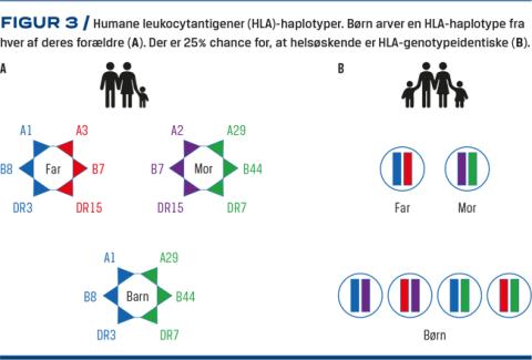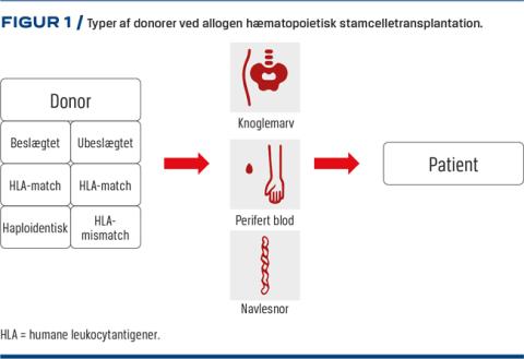 Ved en allogen hæmatopoietisk stamcelletransplantation (HCT) overfører man hæmatopoietiske stamceller fra en rask donor til en patient (Figur 1). Denne behandling kan være livreddende eller helbredende for patienter med hæmatologiske neoplasier, knoglemarvssvigt, medfødte defekter i immunsystemet, enzymdefekter i metabolismen eller hæmoglobinopati. Donoren kan være beslægtet eller ubeslægtet med patienten, og det transplanterede stamcelleprodukt kan høstes fra donorens knoglemarv, perifere blod efter knoglemarvsstimulerende mobilisering eller fra navlesnoren [1]. Antallet af allogene HCT var i 2019 mere end 21.000 internationalt [2, 3] og ca. 150 i Danmark. En succesfuld transplantation kræver, at donorvalget er baseret på præcise undersøgelser af den individuelle immungenetik i form af vævstyper (humane leukocytantigener (HLA)), der skal ligne hinanden mest muligt hos patient og donor [4]. Donorvalget er således et eksempel på anvendt personlig medicin.