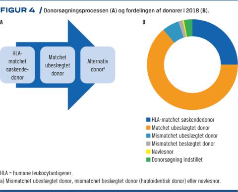 For ca. 85% af de patienter, der var henvist til ubeslægtet donorsøgning i 2018, kunne vi i vores afdeling identificere en donor, som var matchet for 9-10 ud af patientens ti forskellige HLA-A-, -B-, -C-, -DRB1- og -DQB1-typer. For de resterende 15% kunne vi i de fleste tilfælde finde en såkaldt alternativ donor, der kan være en mismatchet ubeslægtet donor eller en haploidentisk familiedonor (mismatchet beslægtet donor), og hvor både søskende, forældre og børn kan komme i betragtning, eller navlesnor, hvor kravet til matchgrad er lavere (Figur 4). Da haploidentiske familiedonorer og navlesnor ofte er hurtigt tilgængelige, kommer disse donorer også i betragtning, hvis en HCT skal iværksættes akut, da det i gennemsnit tager 30 dage at identificere en egnet ubeslægtet voksen donor i vores laboratorium. Fælles for de alternative donorer er den lavere matchgrad, der betyder, at patienten kan have antistoffer rettet mod flere af donorens fremmede HLA-uforlig, hvilket øger risikoen for afstødning [12-16] og skal undgås eller risikostratificeres [17]. Udvælgelsen af en alternativ donor medfører derfor individuelle overvejelser og kompromiser.