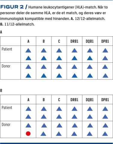 HLA-systemet afspejler den mest personlige del af vores genom og kodes således af grupper af gener, som uden sammenligning udviser den største individuelle variation (polymorfi) og har den stærkeste association til sygdom [6]. Der er beskrevet mere end 26.000 forskellige HLA-udgaver (alleller). Det tilstræbes, at donor og patient deler de samme typer (alleller) af HLA-A,-B,-C,-DRB1 og-DQB1-generne og hvis muligt også HLA-DPB1 [7, 8] – et såkaldt 10/10-match eller 12/12-match (Figur 2). Et afgørende omdrejningspunkt for behandlingssucces bliver herved tilpasning til patientens personlige immunsystem i donorsøgningen.