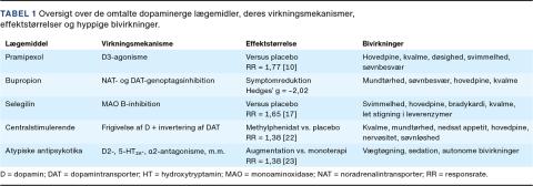 I et systematisk review med metaanalyse sammenlignede man bupropions effekt med hhv. placebo og andre antidepressiva, og man undersøgte desuden effekten af bupropion givet sammen med andre antidepressiva [12]. I metaanalysen inkluderedes 5 RCT’er (n = 2.127), og man fandt, at bupropion medførte større symptomreduktion (Hedges g: 2,02; 95% KI: 2,92-1,11) end placebo. Bupropion havde en effekt, som svarede til andre antidepressivas (herunder sertralins, fluoxetins og venlafaxins) og var desuden effektivt som add-on til andre antidepressiva (især SSRI). Hyppige bivirkninger var mundtørhed, søvnbesvær, hovedpine og kvalme. Byrden af bivirkninger fandtes at være sammenlignelig med byrden ved andre antidepressiva. Der sås faktisk vægttab og bedret seksuel tilfredshed ved behandling med bupropion alene og lindring af vægtrelaterede og seksuelle bivirkninger af SSRI efter tillæg af bupropion.