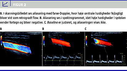 Hvis PRF sættes for lavt, opstår der et fænomen, som kaldes aliasering. Dette er specielt afgørende i Dopplerundersøgelser med farve- og spektral-Doppler, hvor både positive og negative hastigheder estimeres. Aliasering viser sig ved, at hastigheder, der falder uden for skalaen, registreres med ændret fortegn og modsatrettet flow. Hvis PRF derimod sættes for højt i forhold til de faktiske hastigheder i karret, kan registreringen af flowet helt udeblive, fordi skalaens grænser er for vide (Figur 2 ). PRF skal derfor altid justeres til det aktuelle flow [1, 6].