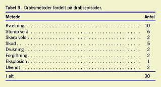 I 22 drabsepisoder var der tale om enkelt drab, i fem drabs-episoder var der tale om drab på to børn, og i tre drabsepiso-der var der tale om drab på tre børn.