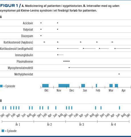 Kleine-Levins syndrom (KLS) er en sjælden søvnsygdom, der har en estimeret prævalens på 1-2 pr. mio. og er karakteriseret ved recidiverende episoder af 1-2 ugers varighed med hypersomni kombineret med adfærdsmæssige og kognitive forstyrrelser. KLS debuterer oftest i teenageårene, og imellem episoderne er patienterne asymptomatiske. Episoderne ophører spontant med en median sygdomsvarighed på ca. 13 år. Ætiologien er ukendt, men man formoder, at det drejer sig om en autoimmun sygdom [1, 2]. Der foreligger ikke undersøgelser, hvor man har dokumenteret en effektiv medicinsk behandling [1, 3], men lithium har vist sig at være effektiv i nogle tilfælde [4].