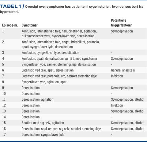 En 15-årig dreng debuterede pludselig med svær træthed, konfusion, absencelignende episoder, fysisk uro, hallucinationer og til tider også agitation. Han var i søvnunderskud fra forrige døgn. Han blev indlagt akut på mistanke om encefalitis.