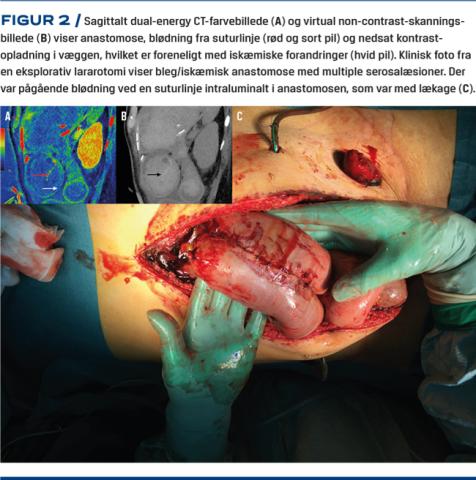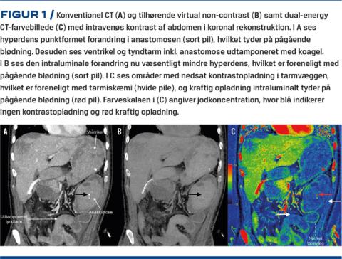 Skanningen viste pågående arteriel blødning fra jejunum. Derudover var ventrikel, duodenum og jejunum inklusive anastomosen udtamponeret med koagler. Man overvejede initialt angiografisk embolisering af blødningen, alternativt gastroskopi. Ved efterfølgende vurdering af DECT så man dog, at anastomosen ved jejunum og tilgrænsende tyndtarm var dilateret med større områder i væggen uden kontrastopladning foreneligt med iskæmi, hvorfor der blev udført eksplorativ laparotomi. De iskæmiske forandringer blev initialt ikke erkendt på de konventionelle CT-billeder pga. koagel i lumen (Figur 1).