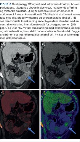 I den akutte diagnostik kan DECT bidrage i diagnosticeringen af akut tarmiskæmi ved brug af VM-rekonstruktioner og jodmaps, som kan fremhæve hypoperfunderede tarmsegmenter [16]. DECT er ligeledes pålidelig i differentieringen mellem urat- og nonuratsten i urinvejene [17], og visse CT-negative galdesten kan visualiseres med DECT (Figur 3) [18].