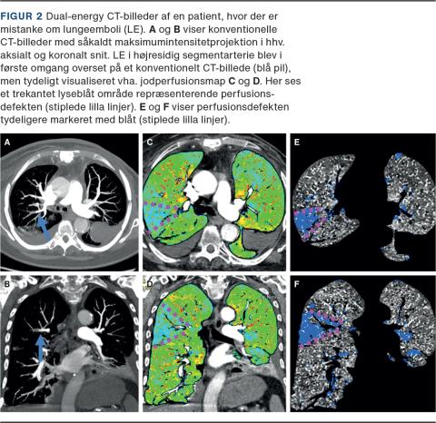 Klinisk anvendes DECT i det pulmonale kredsløb i diagnosticeringen af lungeemboli (LE). Ved brug af jodmapping kan man supplerende til den konventionelle CT-angiografi visualisere eventuelle perfusionsdefekter i lungeparenkymet og dermed den direkte hæmodynamiske effekt af embolien (Figur 2). Teknikken bliver i tiltagende grad anvendt i klinikken og er mest gavnlig ved okklusiv LE på segmentalt og subsegmentalt niveau. I et større retrospektivt studie med 1.144 LE-skanninger blev der konstateret LE på 147 skanninger med konventionel CT. Ved gennemgang med jodmapping blev yderligere 11 LE detekteret svarende til 1,0% [2].