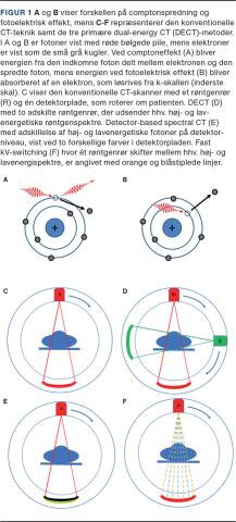 Attenuationen, som er et produkt af vekselvirkningen mellem fotoner og væv, bygger på to fysiske principper: fotoelektrisk effekt og comptonspredning (Figur 1). Ved den fotoelektriske effekt absorberes fotonenergien fuldstændigt af en tætbundet elektron i den inderste elektronskal, mens fotonenergien i comptonspredningen bliver dæmpet og delt mellem en løst bundet elektron og en spredt foton. Den fotoelektriske effekt dominerer ved lave fotonenergier især i væv med højt gennemsnitligt atomnummer som f.eks. jodkontrast og calcium, mens comptonspredning gør sig mest gældende ved høje fotonenergier og i væv med højere elektrondensitet. I modsætning til konventionel CT, hvor der anvendes ét røntgenspektrum, bruges der ved DECT data fra to røntgenspektre med lav- og højenergifotoner [5]. Med DECT-data kan man således matematisk bestemme, hvilken del af attenuationen der kan tilskrives elektrondensiteten, samt det gennemsnitlige atomnummer, hvorved vævsidentifikation muliggøres.